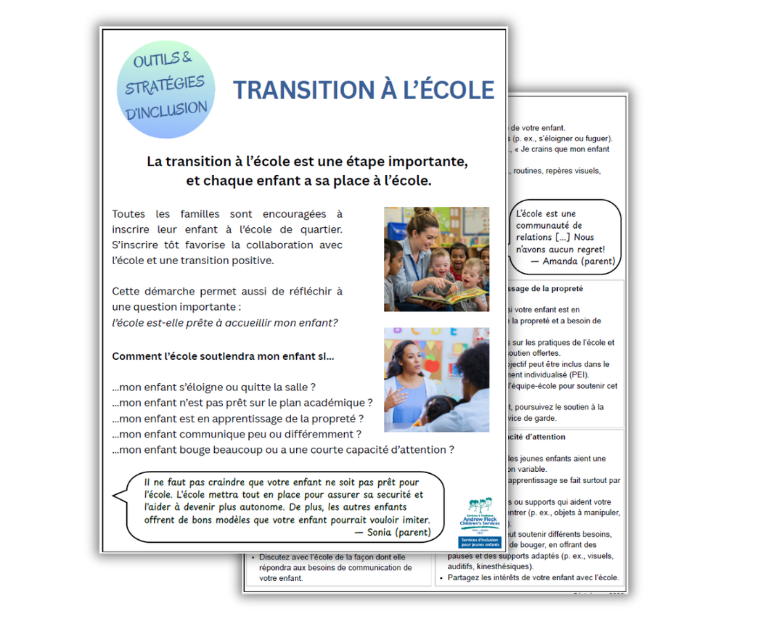 La fiche conseil suivante met en lumière quelques considérations utiles concernant la préparation à l’école, notamment en ce qui concerne l’apprentissage de la propreté, la communication, les préoccupations liées à la sécurité, et plus encore : Transition à l’école – Fiche conseil.