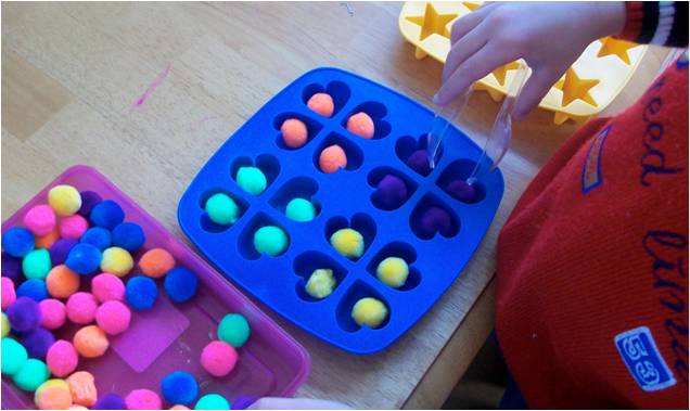 - demandez aux enfants d’utiliser des pinces pour déplacer les billes et les autres objets