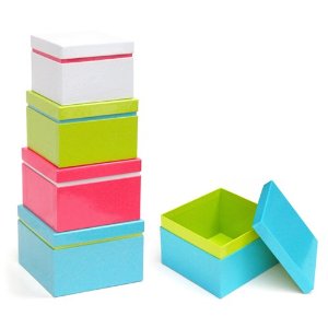 Trouver des séries de boîtes à cadeaux à encastrer rectangulaires, carrés ou circulaires de différentes couleurs ou motifs. Encourager les enfants à ouvrir, fermer, encastrer et empiler les boîtes. Discuter des différents motifs et couleurs.