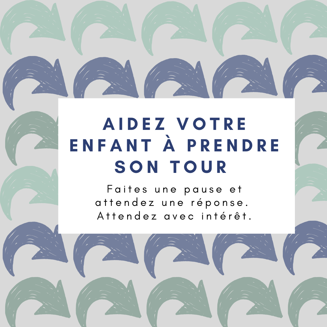 Aidez à votre enfant à prendre son tour : Tout d’abord, portez attention à votre enfant. Observez leur niveau d’excitation, leur activité, leur jeu ou leur intérêt. Suivez leur initiative puis attendez. Voici d’autres idées :