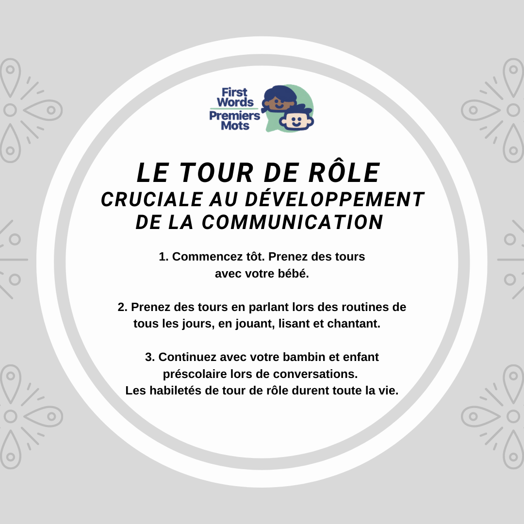 Les tours de rôle dès la naissance : Au début, les bébés apprennent à communiquer principalement pour que leurs besoins soient satisfaits et pour entrer en contact avec leurs parents. Au début, les bébés comprennent peu les mots que nous utilisons et comment communiquer. En leur parlant, les observant et en interprétant leurs mouvements de bras et leurs rires, votre bambin apprend les sons, les mots mais aussi la logistique de la communication. Ils apprennent au sujet de la vie et du monde en vous entendant parler.