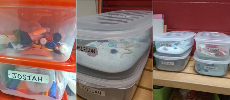Voici des exemples partagés par divers services de garde, de la façon dont le matériel peut être organisé dans des bacs individuels.