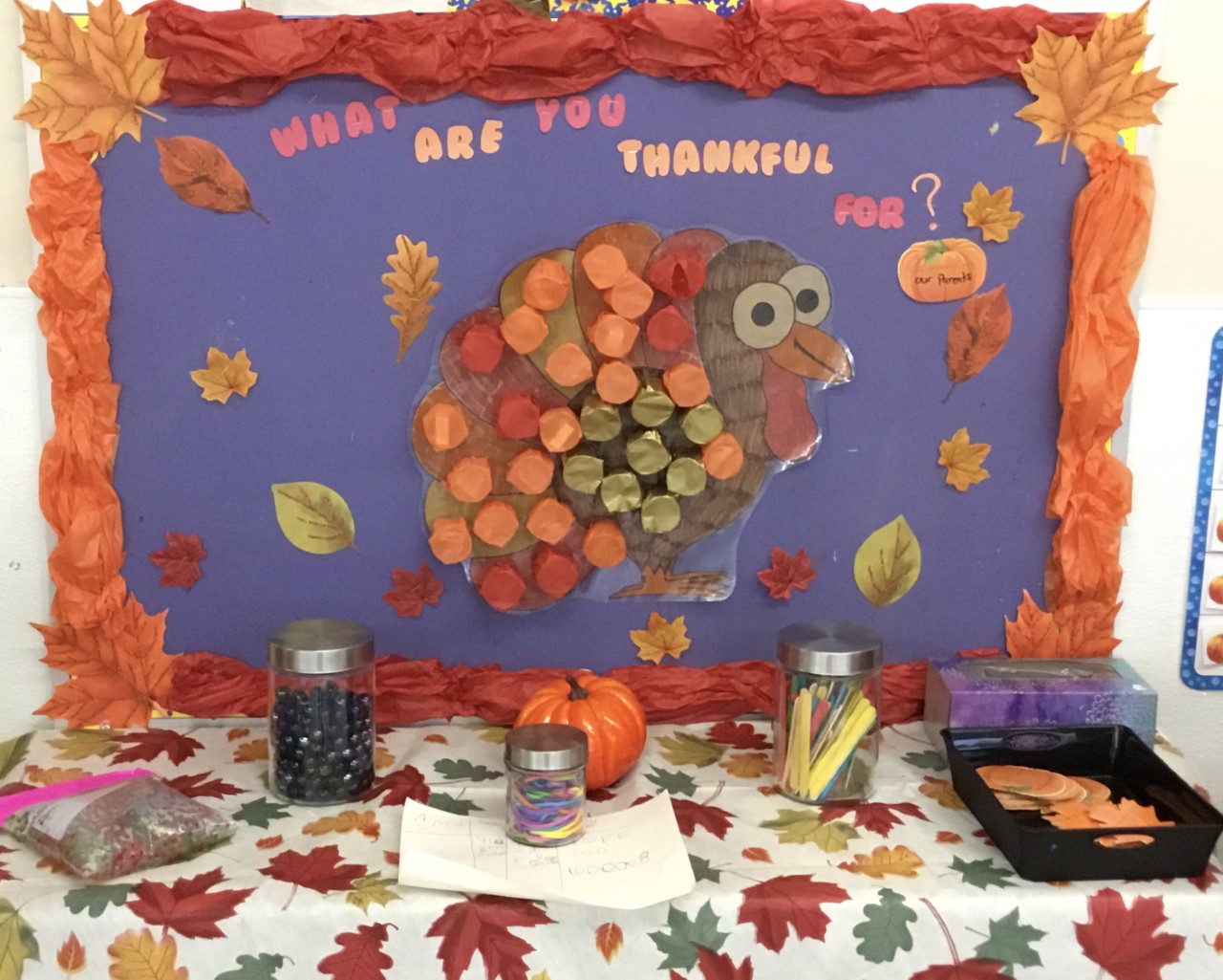Au mois d’octobre, pour célébrer l’Action de grâce, nous avons eu 31 jours de reconnaissance. Avec du papier de soie, nous avons recouvert 31 petits gobelets (verres à liqueur en plastique) dans lesquels nous avons inséré une raison d’être reconnaissant. Mme Davis a dessiné une dinde sur laquelle nous avons collé les gobelets pour le mois. Chaque jour, nous avons percé un gobelet et discuté du mot qu’il contenait et de la raison pour laquelle nous en étions tous personnellement reconnaissants.