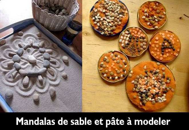 Les mandalas sont des motifs de cercles concentriques qui se développent vers l’extérieur et sont censés représenter l’harmonie et la plénitude de l’univers et de l’esprit. La création de mandalas peut favoriser la relaxation en calmant et en mettant l’emphase sur l’attention. L’ajout d’éléments sensoriels tels que du sable, de la pâte à modeler, du riz et des éléments , style « loose parts », de la nature augmente l’expérience tactile et l’engagement des enfants. Il y a tellement de variantes à essayer avec un groupe d’âge scolaire.