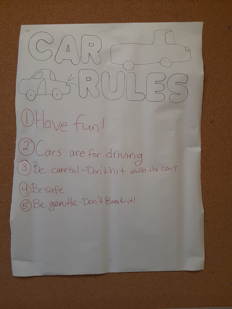 Au centre Keyworth ELC, les enfants d’âge préscolaire ont créé leur propre ensemble de règles pour réglementer leurs comportements lorsqu’ils jouent avec des voitures. L’éducatrice et les enfants se sont réunis pour discuter de la manière dont ils pouvaient jouer en toute sécurité avec leurs voitures. Les enfants ont proposé un ensemble de règles que l’éducatrice a transcrit, mot pour mot. Cet exercice a permis aux enfants de créer leurs propres limites et d’en accepter la responsabilité. L’exercice a également responsabilisé les enfants à faire des choix prudents et leur a fourni les outils pour gérer leurs propres comportements et la confiance nécessaire pour explorer à l’intérieur des limites qu’ils se sont données.