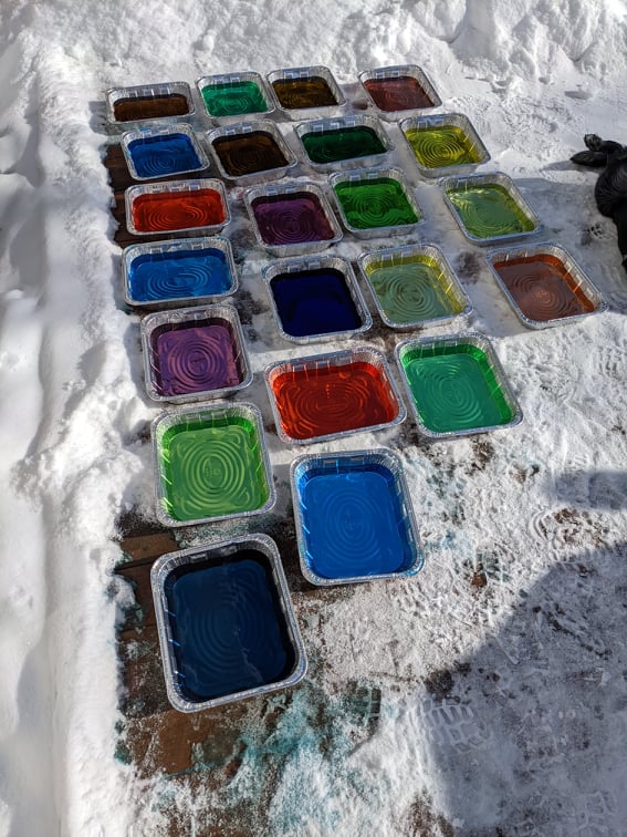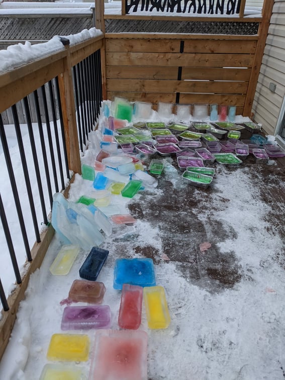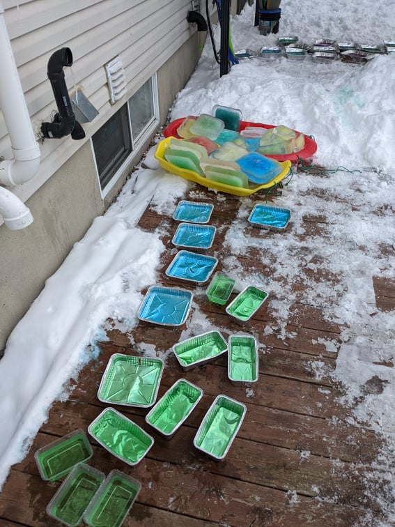 Étape 1 : Remplir les plats d’aluminium avec de l’eau et y ajouter quelques gouttes de colorant alimentaire. Laissez les plats à l’extérieur pour que l’eau se transforme en bloc de glace.