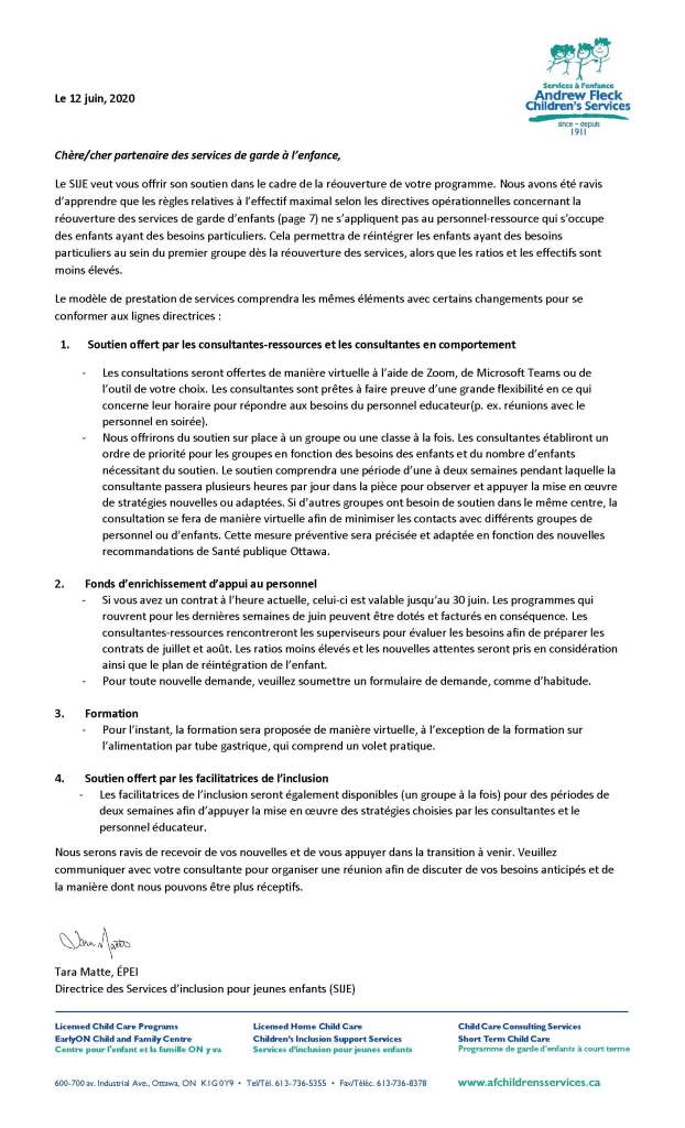 Le SIJE veut vous offrir son soutien dans le cadre de la réouverture de votre programme. Nous avons été ravis d’apprendre que les règles relatives à l’effectif maximal selon les directives opérationnelles concernant la réouverture des services de garde d’enfants (page 7) ne s’appliquent pas au personnel-ressource qui s’occupe des enfants ayant des besoins particuliers. Cela permettra de réintégrer les enfants ayant des besoins particuliers au sein du premier groupe dès la réouverture des services, alors que les ratios et les effectifs sont moins élevés.
