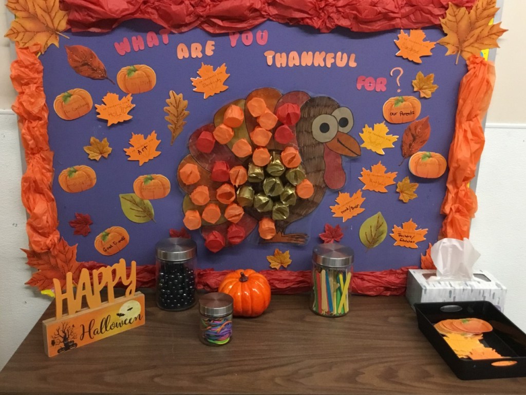 Au mois d’octobre, pour célébrer l’Action de grâce, nous avons eu 31 jours de reconnaissance. Avec du papier de soie, nous avons recouvert 31 petits gobelets (verres à liqueur en plastique) dans lesquels nous avons inséré une raison d’être reconnaissant. Mme Davis a dessiné une dinde sur laquelle nous avons collé les gobelets pour le mois. Chaque jour, nous avons percé un gobelet et discuté du mot qu’il contenait et de la raison pour laquelle nous en étions tous personnellement reconnaissants.